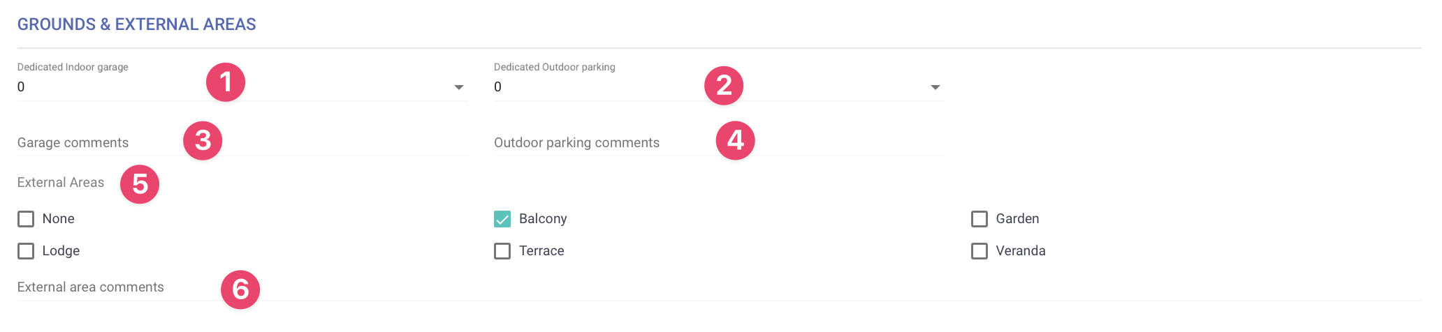 6. **External Area Comments**: Notes on the external areas.\