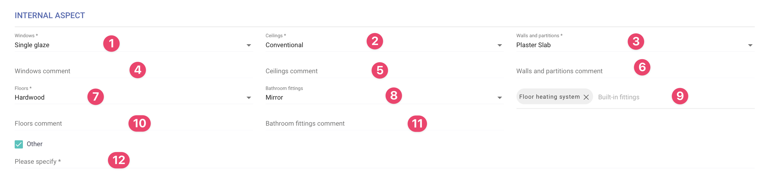 12. **Other**: Specify other internal features not listed.\
