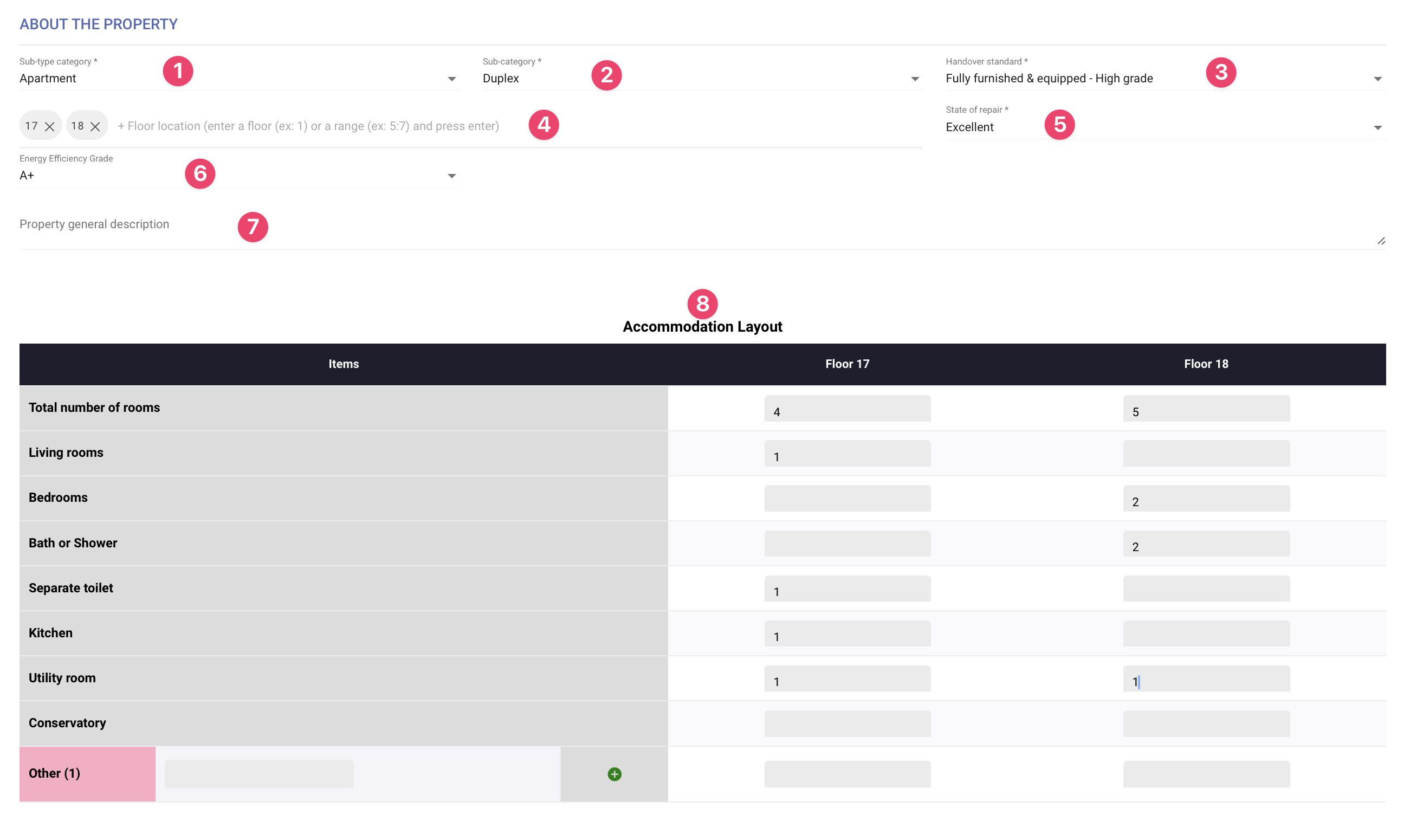 \&#xNAN;*<mark style="color:orange;">**Example:**</mark> <mark style="color:orange;"></mark><mark style="color:orange;">A spacious duplex apartment located on the 17th and 18th floors, featuring modern amenities and high-end finishes.</mark>*